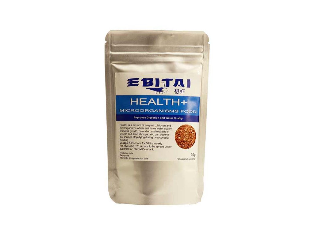 EbiTai Health+ je probiotický doplněk určený pro chovatele krevet, který pomáhá udržovat čistou a stabilní vodu v akváriu a tím zlepšuje celkové podmínky pro chov. Obsah mikroorganismů a enzymů podporuje rozklad organických zbytků, omezuje zápach vody a zlepšuje vstřebávání živin, zatímco přidaný chitosan napomáhá bezproblémovému svlékání, zvyšuje kvalitu pancíře a celkovou vitalitu krevet. V nově zakládaném akváriu se přípravek aplikuje v dávce přibližně 20 čajových lžiček pod substrát, ve fungující nádrži pak 1–2 čajové lžičky na 50 litrů vody týdně.
