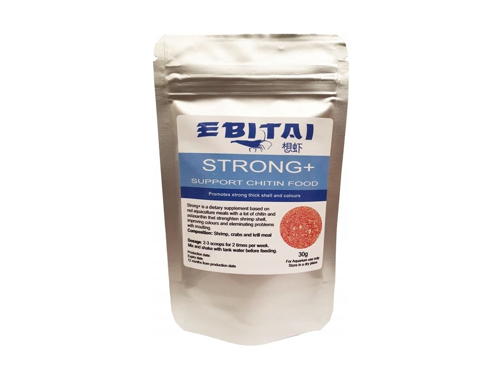 EbiTai Strong je specializované krmivo pro chovatele krevet, které kombinuje účinky dvou osvědčených produktů známých mezi chovateli – Borneo Wild Stout a Benibachi Bee Strong. Díky tomuto složení podporuje výraznější vybarvení krevet, zlepšuje kvalitu a pevnost pancíře, napomáhá bezproblémovému svlékání a snižuje riziko náhodných úhynů spojených se svlekem, což ocení zejména chovatelé citlivějších linií. Balení obsahuje 30 gramů krmiva.